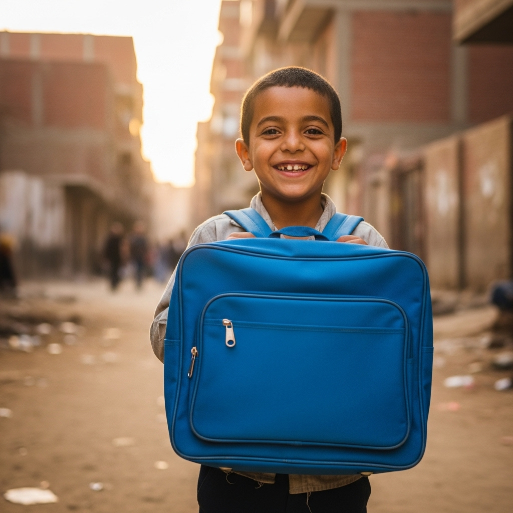 ساعد طفل يروح مدرسته مجهز بالأدوات كاملة.